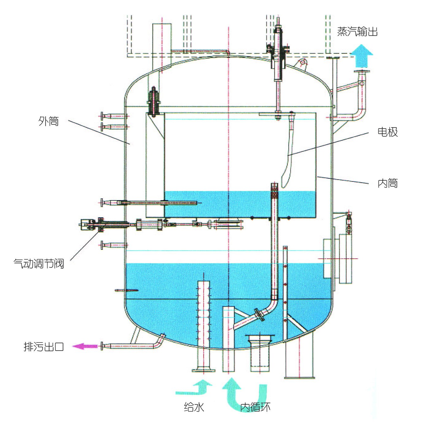 给水泵保证外锅筒保持一定的水位,而内循环泵与气动中心调节阀、压力控制器、水位控制器组成负荷变化的逻辑关系,从而大限度地满足蒸汽负荷的要求。负荷调节税0-100%,波动量小于0.03MPa。高精度的电导率仪表保证了低的电导率,可提供高质量的蒸汽,蒸汽干度可达到99.8%。